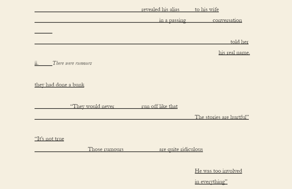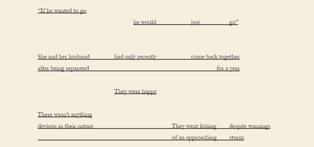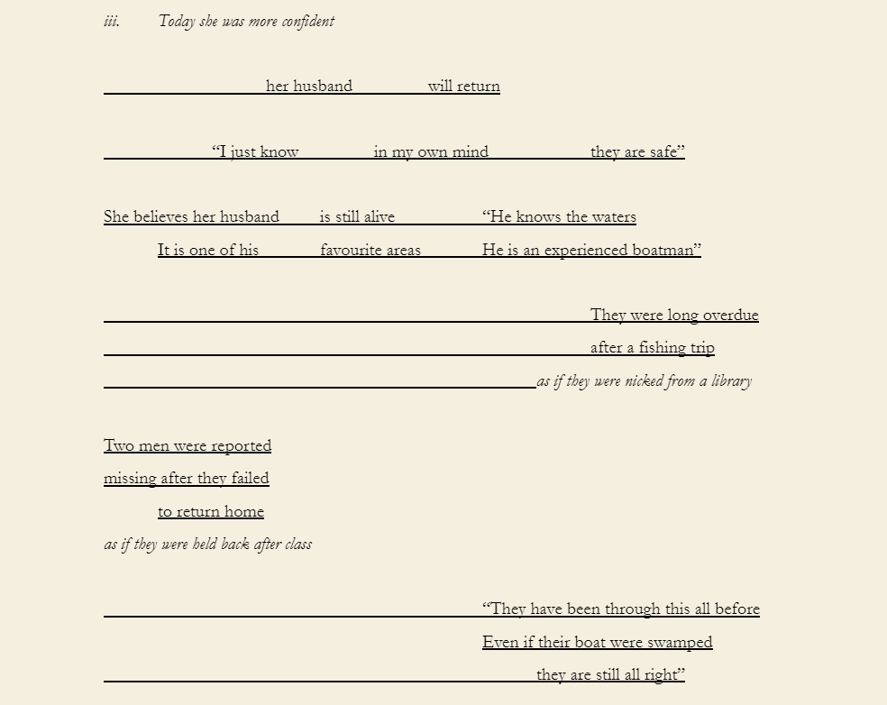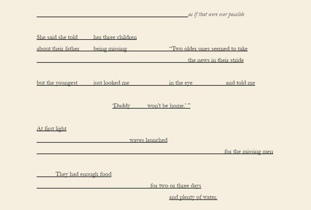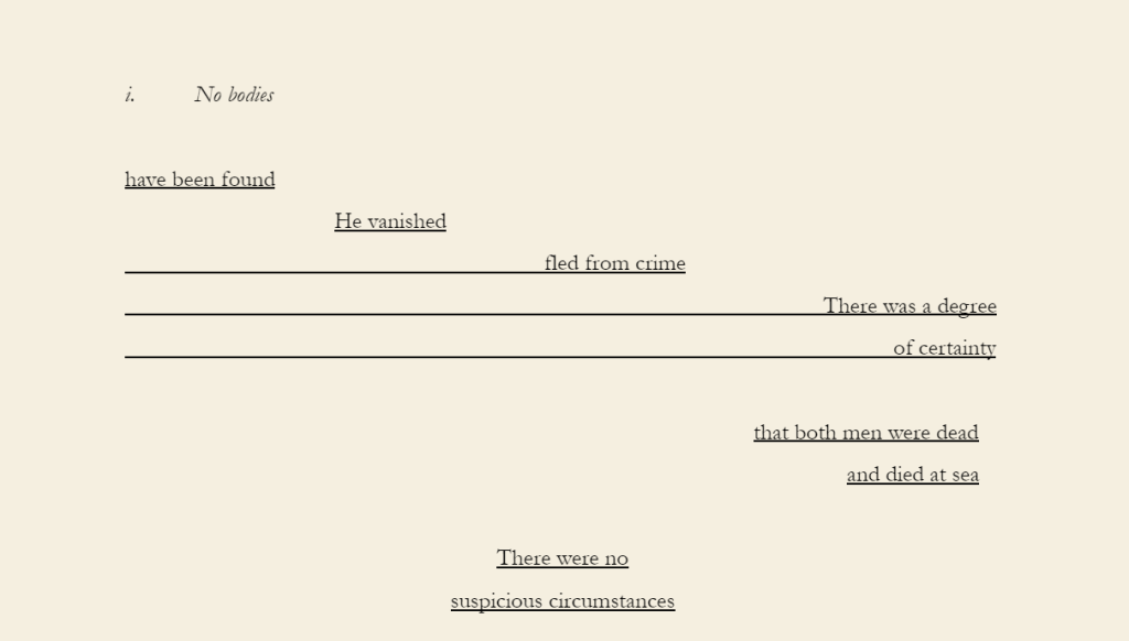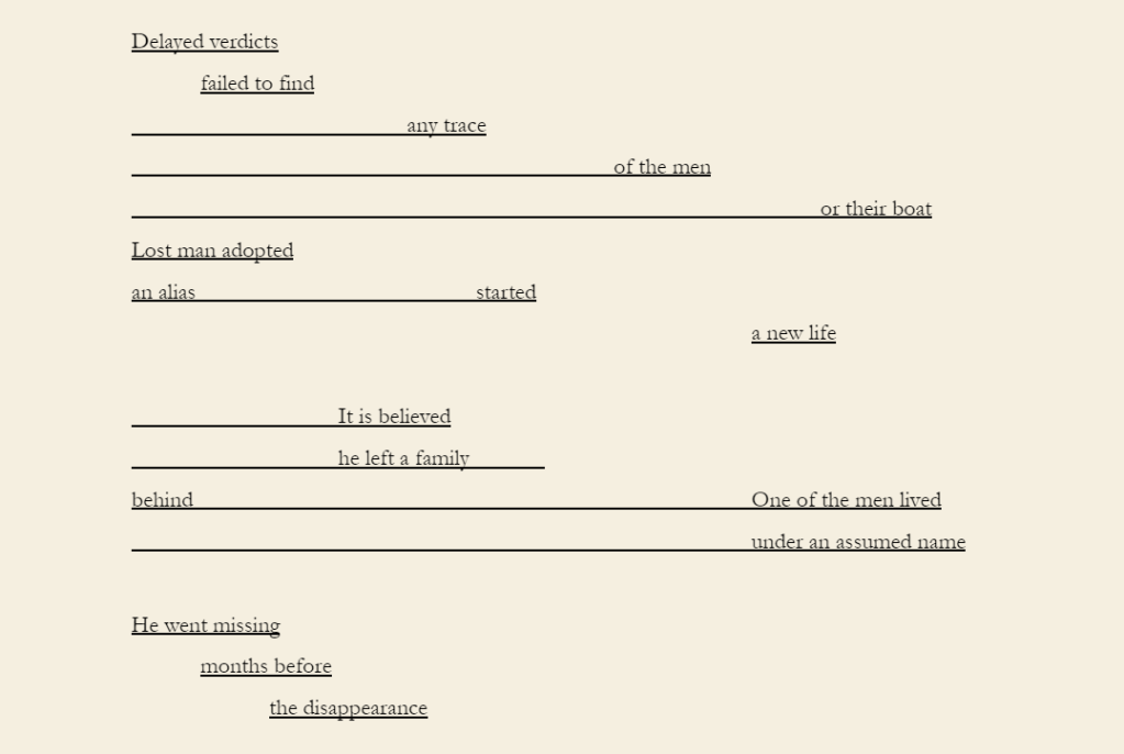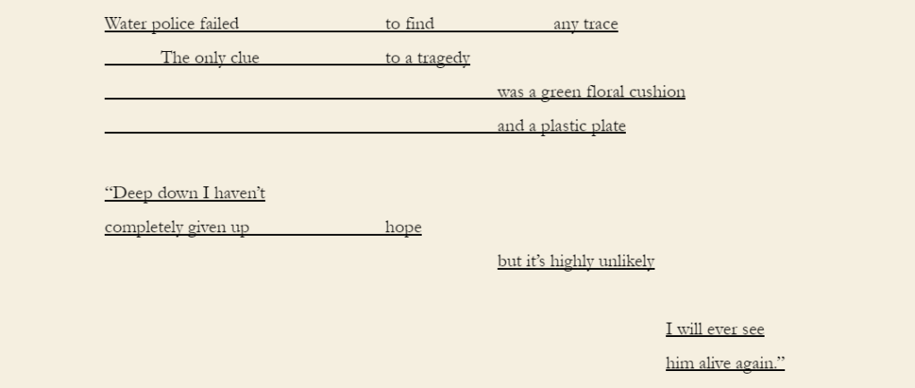 Note: Three Findings uses found text taken from newspapers reporting my grandfather’s disappearance at sea in the Moreton Bay region in late 1980.